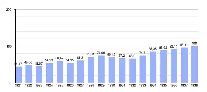 La industria creció notablemente en la época, pero desde un nivel muy bajo y con condiciones malas para los obreros, poco numerosos incluso en vísperas de la Segunda Guerra Mundial: eran 280 311 en 1930 y apenas superaban los 350 000 en 1938.[222] La mayoría de los obreros trabajaba además en talleres y pequeñas industrias, no en grandes fábricas, con escasas diferencias sociales, económicas o de origen con sus patronos.[225] A menudo propietario de una casa o de tierras en su pueblo de origen, ideológicamente estaba cercano a sus antiguos vecinos campesinos o de la pequeña burguesía.[226] Solo algunos sectores menores y grupos, como los refugiados, desarrollaron un movimiento obrero fuerte, pese a las malas condiciones laborales en la industria.[227][nota 14]