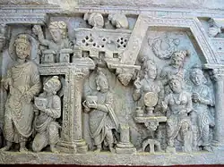 Cultura helénica en el subcontinente Indio: vestiduras griegas, ánforas, vino y música (detalle de la estupa Chakhil-i-Ghoundi, Gandhara, siglo I a. C.)