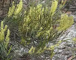 Crece alcanzado un tamaño de entre 1 y 3 metros de altura y produce flores entre agosto y diciembre (fines de invierno a principios de verano) en su área de distribución natural.[2] Las inflorescencias son racimos terminales de color amarillo crema. Las hojas tienen 1-12 cm de largo y de 1 a 9 mm de ancho.