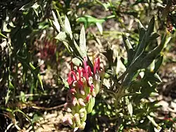 Es un arbusto postrado a erecto que alcanza un tamaño de 0,3-2,0 m de altura, y 3 m de ancho. Las hojas son muy variables, de 2-11 cm de largo, 25-60 mm de ancho, ovadas a obovadas a grandes rasgos, a menudo marcadamente cuneadas en la mitad basal, con varios dientes triangulares (algunos secundarios), o ligeramente a la profundamente lobuladas de primer o segundo orden, rara vez enteras y elípticas. La inflorescencia erecta a curvada con raquis floral de 20-50 mm de largo. Perianto de color verde a crema, el estilo de rosa a rojo, amarillo naranja, de vez en cuando, o pálido, con una punta de color verde. Folículo 10.5-16.5 mm de largo,