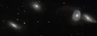 - ↑ a b c Paul Hickson (1997). «Compact Groups of Galaxies». Annual Review of Astronomy and Astrophysics 35: 357-388. Bibcode:1997ARA&A..35..357H. arXiv:astro-ph/9710289. doi:10.1146/annurev.astro.35.1.357.