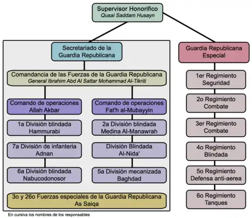 Estaba subordinada al “Aparato de Seguridad Especial del Estado” y no al Ministerio de Defensa como el ejército regular. Estaba dividida en dos cuerpos, uno encargado de la defensa y control del norte de Irak, llamado “Comando de Operaciones Allah Akbar”, que estaba compuesto por unidades blindadas y de infantería. Y el “Comando de Operaciones Fat'h al-Mubayyin”, compuesto básicamente de unidades blindadas y mecanizadas, que estaba emplazado en la parte sur del país. También estaban integradas dentro de la estructura dos divisiones de fuerzas especiales o As Saiqa que actuaban de forma totalmente independiente. La Guardia Republicana la formaban unos 70.000 soldados en seis divisiones,[2] todos voluntarios, y unos 400 tanques soviéticos T-72 y T-62 además de otros vehículos mecanizados. Estas fuerzas estaban intencionadamente lejos de la capital para evitar una posible rebelión contra el régimen.