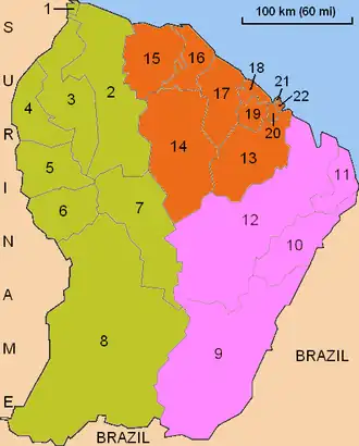 Alcaldía de Cayena.Distrito de Cayena en naranja, San Lorenzo de Maroni en verde y Saint-Georges en rosa.Comunas de Guayana Francesa.