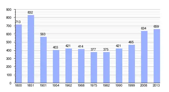 Los datos demográficos contemplados en este gráfico de la comuna de Guerchy[3] se han cogido de 1800 a 1999 de la página francesa EHESS/Cassini, y los demás datos de la página del INSEE.[4]
