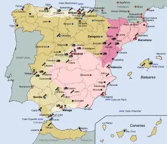 Principales centros de la RepúblicaNada más conocerse el 17 de julio por la tarde que la sublevación militar había triunfado en el Protectorado de Marruecos, el ministro de Marina José Giral (que dos días después acabaría presidiendo el gobierno de la República tras la dimisión de Santiago Casares Quiroga y del gobierno «relámpago» de Diego Martínez Barrio) ordenó que varios barcos de guerra de la Marina se dirigieran al estrecho de Gibraltar para que bloquearan las plazas de Ceuta, Larache y Melilla y evitar así el paso a la península de las tropas coloniales. De la base de Cartagena salieron los destructores Almirante Valdés, Lepanto y Sánchez Barcáiztegui, con orden de navegar a máxima potencia hasta el estrecho.[97] Gracias a que las dotaciones de esos barcos se rebelaron contra sus oficiales, que estaban comprometidos en el golpe, los sublevados no pudieron disponer inicialmente del Ejército de África, compuesto por la Legión Extranjera y los regulares (tropas formadas por marroquíes mandados por oficiales españoles).[93]