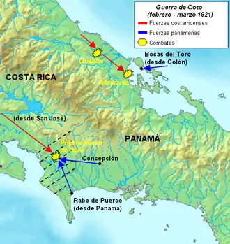 El desarrollo de la guerra se dio en dos escenarios: el primero fue en Coto, donde las fuerzas panameñas en unos días lograron revertir y rechazar las acciones de Costa Rica en la zona, culminando en una victoria táctica de Panamá;[6] el segundo fue en la provincia de Bocas del Toro, que se inició el 4 de marzo, donde las fuerzas costarricenses ocuparon de manera rápida los pueblos de Guabito, Changuinola y Almirante, ya que las fuerzas panameñas se habían retirado estratégicamente hacia la ciudad de Bocas del Toro.[7] La aparición del cañonero estadounidense USS Sacramento el día 5 de marzo, evitó el confrontamiento en esa zona y obligó al retiro de las fuerzas costarricenses hasta más allá del río Sixaola.[7]