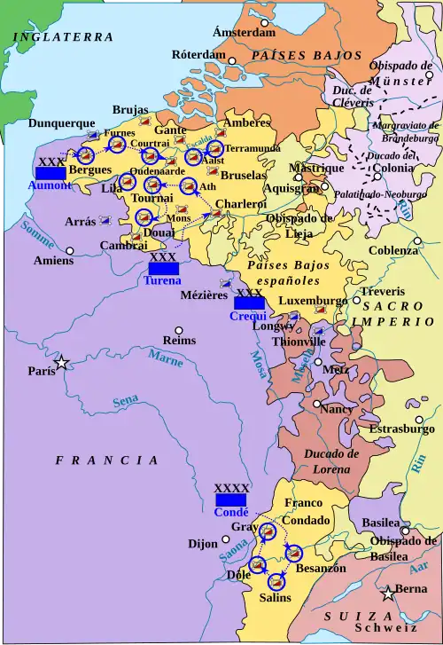 Los franceses dividieron el ejército en tres grupos; el principal, al mando del mariscal general de Turena y compuesto por treinta y cinco mil soldados, penetró en el condado de Henao.[17] Su misión era la de acometer los asedios mayores.[17] El segundo era mucho menor: unos cinco mil soldados al mando del marqués de Créqui, formado sobre todo por caballería, que protegerían el flanco sur, en torno a Luxemburgo.[17] El tercero, unos ocho mil hombres con el mariscal de Aumont a la cabeza, debía invadir la costa y hostigar a las guarniciones de la zona para impedir que acudiesen al interior a colaborar en la defensa.[17] Castel Rodrigo, con sus fuerzas insuficientes, trato de mejorar las defensas de las plazas occidentales y de la capital, en la que concentró dos de los cuatro tercios españoles de los que disponía.[14]