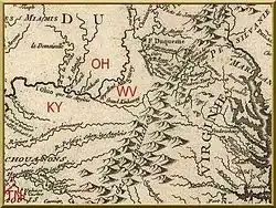 - ↑ "Los shawanese en general parecen en la actualidad los más atentos a los Consejos de las Seis Naciones de todos los del Sur, pero están muy alarmados por el número de personas que van desde Virginia &c en busca de nuevos asentamientos dejando grandes extensiones de país sin colonizar detrás de ellos, y que me apena encontrar que no pueden ser restringidos por ser numerosos, y estar alejados de la influencia y de las sedes del Gobierno, y por las viejas reclamaciones de Virginia que conspiran para alentarlos, siempre y cuando se confinen dentro de la extensión cedida. ...les informé de las intenciones de Su Majestad de formar una colonia en Ohio, y de la evacuación de Fort Pitt, que estaban muy agradecidos por todo lo que tenían y esperaban (página 890) que la persona designada para gobernar allí fuera un hombre sabio y frenara los abusos en el comercio y las irregularidades cometidas por los habitantes de la frontera,..." Carta de Sir Johnson al Conde de Dartmouth, (Johnson Hall, 22 de septiembre de 1773), Johnson, Sir William en: Docs. Rel. to the Col. Hist. of the State N. Y. (London Docs.: XLIII): VIII, pp. 395-397, y en The Papers of Sir William Johnson, vol. 8, pp. 888-891. 1996, Glenn Black Laboratory of Archaeology y The Trustees of Indiana University «Copia archivada». Archivado desde el original el 11 de marzo de 2009. Consultado el 17 de julio de 2009.
