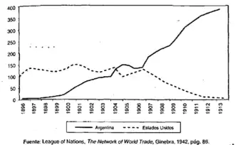 - ↑ ROCCHI. Fernando. El péndulo de la riqueza: la economía argentina en el período 1880-1916. Nueva Historia Argentina Tomo 5: El Progreso, La Modernización Y Sus Límites (1880-1916). UNTREF VIRTUAL. p. 4