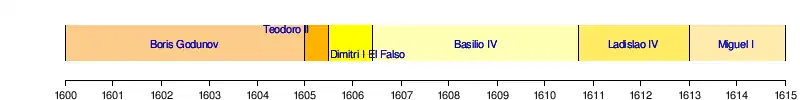 | 19 de mayo de 1606 | Los aliados de Basilio Shuisky declararon zar Basilio IV. | Basilio IV (r. 1606-1610) | |