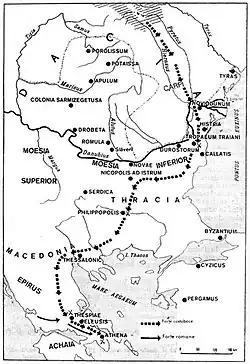 Durante esa campaña el gobernador de Dacia y Mesia Superior, el legado Marco Claudio Frontón, murió en combate[ILS 3] en algún punto no determinado del Bajo Danubio, lo que abrió los Balcanes a los costobocos,[5] y poco después se construyeron fortificaciones en Salona.[CIL 7] Tito Julio Juliano fue enviado con una vexillatio a limpiar Acaya y Macedonia de sus partidas.[AE 6][CIL 8] Con la participación de Pertinax y Pompeyano, los costobocos finalmente serían expulsados.[Bi. 18]