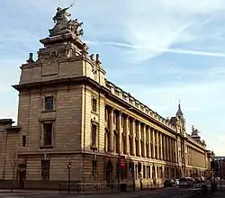 El edificio actual, que fue diseñado por Sir Edwin Cooper para acomodar las oficinas cívicas y los tribunales de justicia, fue construido por Quibell, Son & Green of Hull entre 1906 y 1914.[4] El extremo este del edificio actual se encuentra en el sitio del ayuntamiento de Brodrick.[2] La fachada principal de Alfred Gelder Street se construyó con un elemento central flanqueado por dos largas columnatas con pabellones en cada extremo.[2] En cada uno de los pabellones se colocaron grandes esculturas de Albert Hodge, una de una figura femenina sobre un barco tirado por caballitos de mar y la otra de una figura sobre un carro flanqueado por leones.[2] Un reloj construido por Cooke y Johnson fue trasladado del ayuntamiento de Brodrick al nuevo edificio.[1]
