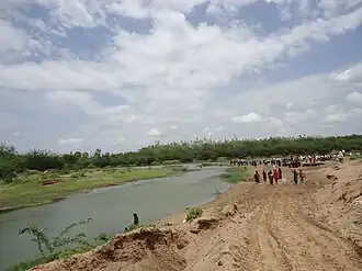 Una presa del siglo XV construida por los reyes Gajapati[2]​ se extiende a ambos lados del río en su entrada a las llanuras. Es una presa de materiales sueltos que tapona el caudal del río. Es llamada presa Cumbum, tiene 17 m de altura, un área de drenaje de 1100 km² y una capacidad de 105 000 000 m³.[2]​ El río continúa su curso y pasa por la ciudad de Markapur y se dirige a la costa de Coromandel a través de la ciudad de Addanki. Finalmente entra en el golfo de Bengala, a unos 19 km al este de Ongole después de haber recorrido una distancia de 225 km.