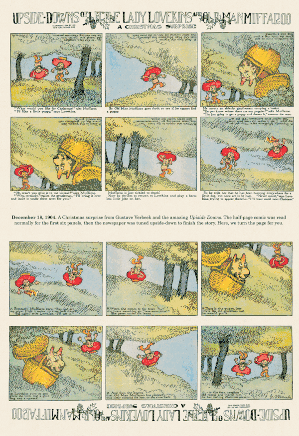 El título completo de la tira era The Upside Downs of Little Lady Lovekins and Old Man Muffaroo. Se publicó semanalmente en las páginas del New York Herald entre el 11 de octubre de 1903 y el 15 de enero de 1905 (64 tiras en total). El argumento era muy sencillo: Lady Lovekins y su mentor Muffaroo se adentraban en un mundo fantástico, habitado por bestias salvajes, monstruos y extraños seres, en el que cualquier cosa podía ocurrir. Al dar la vuelta a la página, cada uno de los dos personajes principales (Lady Lovekins y Muffaroo) se transformaba en el otro y la historia continuaba, con un curioso giro argumental.