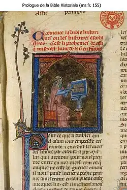 Para una edición crítica del libro de la Génesis y un análisis de las fuentes de la obra, ver también Xavier-Laurent Salvador, Vérité & écriture (s)¸ Paris, Champion, 2005. Antes de la edición de la BH, se conocía una Biblia en francés destinada a los estudiantes de la Universidad, la Biblia así llamada "del siglo trece". Se trata de un texto del que ya no poseemos más que el libro de la Génesis conservado en unos pocos manuscritos e insertados como introducción de Biblias Historiales con las que los lectores parecían confundirla. La Biblia Historial se presenta como una Biblia glosada, es decir una biblia donde figuran las traducciones de los párrafos de la Vulgate con caracteres nobles e intercalados entre cada capítulos, una serie de comentarios. Así con bellas letras figuran las traducciones de la Vulgate, inmediatamente seguidas por la misma traducción del mismo trozo sacado de Comestor. Unos títulos de capítulos, extraídos de Comestor, están insertados en rojo en la página. Su texto es, ante todo, una traducción original de la Vulgate acompañada por la traducción de las Historias de la Biblia. Así como la traducción de la Vulgate en la Biblia de 1250 era acompañada por la Glossa Ordinaria.