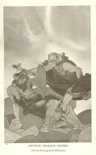 Pryderi y sus hombres marchan al norte, donde libran una batalla entre los lugares de Maenor Bennardd y Maenor Coed Alun, pero se ven obligados a retirarse. Son entonces perseguidos hasta Nant Call, donde otra parte de sus hombres mueren masacrados, y luego hasta Dol Benmaen, donde sufren una tercera derrota. Para evitar más derramamiento de sangre, se llega al acuerdo de que el resultado de la batalla ha de decidirse por medio de un combate singular entre Gwydion y Pryderi. Los dos contendientes se encuentran entonces en un lugar llamado Y Velen Rhyd en Ardudwy, y "gracias a la fuerza, el valor, la magia y el encantamiento", Gwydion triunfa y Pryderi muere. Los hombres de Dyfed se retiran a sus tierras, lamentando la muerte de su señor.