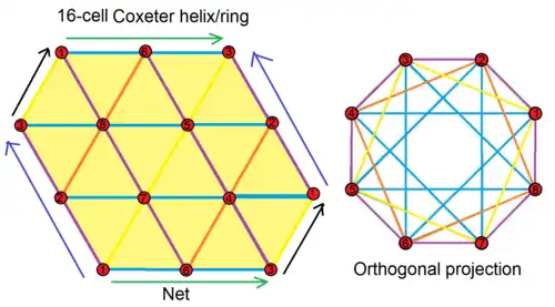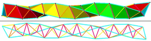 ![]() Los bordes se pueden colorear en 6 grupos, 3 hélices principales (cian), con los bordes cóncavos formando hélices lentas hacia adelante (magenta) y dos hélices hacia atrás (amarillo y naranja) |