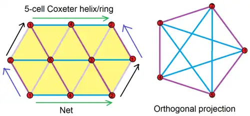 | 4-politopo | Anillos | Tetraedros/anillo | Longitudes de ciclo | Red | Proyección |