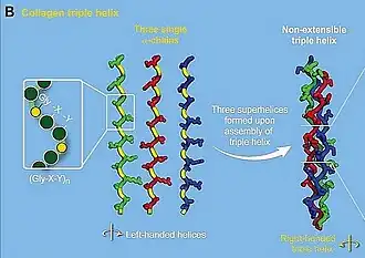 Al enrollarse las tres hélices para formar la triple hélice de colágeno lo hacen de forma dextrógira. Es decir, la triple hélice de colágeno es una hélice dextrógira formada por tres hélices levógiras.[12]
