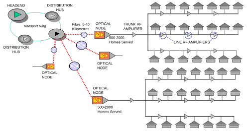 En lugar de eso, la fibra óptica termina en un dispositivo de la red llamado puerta de enlace (gateway), el cual contiene, al menos, un transformador óptico (normalmente, dos) que permite la transición de la señal a la red de cable coaxial.