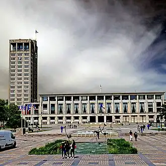 En 1953 se fundió el primer pilote del cuerpo central, en 1954 se inició la torre de 18 plantas y 90 mètres de altura, que en un principio recordaba a un campanario. El teatro contiguo fue inaugurado en octubre de 1967. La ampliación en la fachada norte del edificio, esencial pero estéticamente cuestionable, data de 1987. Como todos los edificios principales, volvió aproximadamente a su posición anterior a la guerra. Situado en la perspectiva de una gran plaza, el edificio establece una dialéctica entre dos unidades: una torre que alberga las oficinas administrativas y un largo edificio salpicado por una imponente columnata en la que se sitúan las funciones de recepción como los grandes salones. Una amplia escalera parte de la planta baja para dividirse en dos tramos distribuyendo la planta noble: tal refugio soberano la columnata soporta completamente la carga de la azotea que alberga una estructura secundaria que soporta los pisos y grandes ventanales.[1]