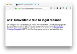 HTTP 451 Unavailable For Legal Reasons (No disponible por razones legales en inglés) es un código de estado del protocolo HTTP mostrado cuando el usuario pide un recurso que no se puede servir por razones legales, como una página web censurada por el gobierno. El número 451 es una referencia a la novela de Ray Bradbury llamada Fahrenheit 451, en la cual los libros son ilegales. [1] El código 451 puede entenderse como una variante más específica del código HTTP 403. Este código de error está estandarizado en el RFC 7725.[2]