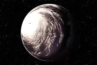 - ↑ Las recreaciones de planetas tipo-tierra pertenecientes a enanas rojas que realizan los expertos, habitualmente presentan un aspecto conocido como «Tierra "globo ocular"», consecuencia directa de su anclaje por marea —con un hemisferio permanentemente expuesto a la luz estelar y el otro en perpetua oscuridad—.[2] En un planeta océano, el punto subsolar contaría con una gigantesca tormenta por la fuerte evaporación de las masas de agua, mientras que el hemisferio nocturno registraría temperaturas muy bajas capaces de formar un gigantesco casquete de hielo sobre la práctica totalidad del mismo, tal y como se aprecia en la imagen.[3]