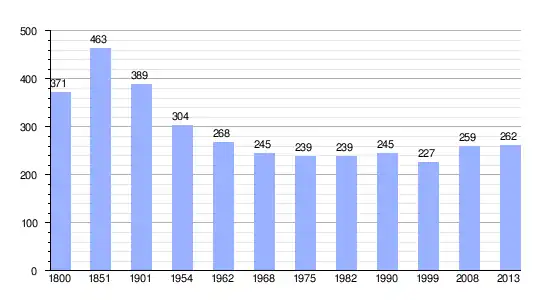 Los datos demográficos contemplados en este gráfico de la comuna de Haleine[4] se han cogido de 1800 a 1999 de la página francesa EHESS/Cassini, y los demás datos de la página del INSEE.[5]