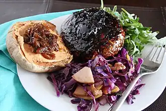 La hamburguesa es un sándwich de legumbres que puede ser frita o asada, usualmente es presentada en un pan ligero partido y acompañada por aros de cebolla, hojas de lechuga, rodajas de tomate, brote de soja, encurtidos, queso vegetal y papas fritas. Se suele aliñar con salsa de tomate, guacamole, mostaza, mayonesa vegana o salsa picante.