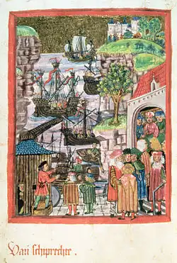 - ↑ Alguna fuentes coinciden en que se trata del puerto de Hamburgo, mientras que otras apuntan a Lübeck e incluso Luneburgo, y otras afirman que no se trata de un puerto en particular sino de una representación genérica de un día ajetreado en un puerto hanseático. Alguna fuente afirma que se trata de una representación de los puertos de Hamburgo y Lübeck juntos.