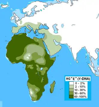 - E1b1a1 (P1/PN1, M2/DYS271/SY81, M180, M291 y 261 marcadores más), antes E3a, es predominante en hablantes de lenguas nigero-congoleñas, tiene la mayor diversidad y alta frecuencia en África Occidental (80 %).[23] Es también mayoritario en la población negra de América, encontrándose en afroamericanos de EE. UU. un 62 %[29] y tiene menores frecuencias en Norte de África, Cuerno de África y Cercano Oriente. Alta frecuencia en los bamilekes con 100 %,[30] en los nande 100 %, ewé 97 %, ga 97 %, fante 84 %, ovambo 82 %, baganda 77 %, hereros 71 %,[18] yorubas 93%,[31] en pueblos bantoides del sur de Camerún como bamilekes, ewondo y bakaka promedia 93 %, en fulanis s de Burkina Faso 90 %,[16] en igbos 89 %, en hablantes de lenguas Cross de Nigeria 87%,[32] en mandingas 87 %,[17] en bantúes de Gabón 86%,[33] en Senegal 81 %,[34] en Bijagós 76 %, balantas 73 %, fulanis 73 %, nalúes 71 %,[17] en los luo 66 %,[18] wólof 68 %, zulúes 55 % y xhosas 54 %.[18] En Madagascar es el principal linaje con 35 %,[35] encontrándose en los tandroy de Androy 70 %, antanosy de Anosy 49 %, merina de Antananarivo 44 % y antaisaka de Atsimo-Atsinanana 37.5%.[36] En América es frecuente en Las Bahamas con 59%.[37]