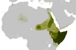 - E-V32 típico de hablantes de lenguas cushitas como los borana de Kenia con 71 %,[55] en Somalia (52 a 77 %), en oromos de Etiopía (32 %) y en beyas de Sudán; también en algunos nilosaharianos como los masalit y fur de Darfur (Sudán),[19] en menor frecuencia en Chad y en otras zonas de África del Norte