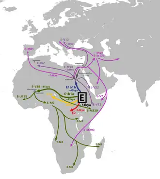 - E1b1b (M215/Page40): 41 500 años[5] en el África Oriental[3] o Cuerno de África,[10] probablemente Etiopía.