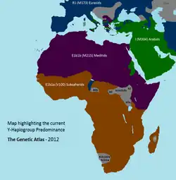 - E1b1a1 (P1/PN1, M2/DYS271/SY81, M180, M291 y 261 marcadores más), antes E3a, es predominante en hablantes de lenguas nigero-congoleñas, tiene la mayor diversidad y alta frecuencia en África Occidental (80 %).[23] Es también mayoritario en la población negra de América, encontrándose en afroamericanos de EE. UU. un 62 %[29] y tiene menores frecuencias en Norte de África, Cuerno de África y Cercano Oriente. Alta frecuencia en los bamilekes con 100 %,[30] en los nande 100 %, ewé 97 %, ga 97 %, fante 84 %, ovambo 82 %, baganda 77 %, hereros 71 %,[18] yorubas 93%,[31] en pueblos bantoides del sur de Camerún como bamilekes, ewondo y bakaka promedia 93 %, en fulanis s de Burkina Faso 90 %,[16] en igbos 89 %, en hablantes de lenguas Cross de Nigeria 87%,[32] en mandingas 87 %,[17] en bantúes de Gabón 86%,[33] en Senegal 81 %,[34] en Bijagós 76 %, balantas 73 %, fulanis 73 %, nalúes 71 %,[17] en los luo 66 %,[18] wólof 68 %, zulúes 55 % y xhosas 54 %.[18] En Madagascar es el principal linaje con 35 %,[35] encontrándose en los tandroy de Androy 70 %, antanosy de Anosy 49 %, merina de Antananarivo 44 % y antaisaka de Atsimo-Atsinanana 37.5%.[36] En América es frecuente en Las Bahamas con 59%.[37]