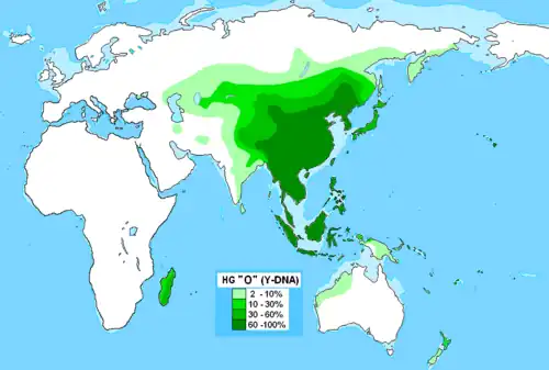 El haplogrupo O (M175, Y3294 y otros) es predominante y casi exclusivo de Asia oriental y del Sudeste de Asia. Se encontró que es mayoritario por ejemplo en los han de China con una frecuencia del 81%,[4] en los han de Taiwán 89%,[5] en aborígenes de Taiwán 88%,[6] en los tai 88%,[7] en Java 87%,[8] en filipinos 80%,[9] en Corea del Sur 79%,[10] al extremo noreste de India 80%,[11] en manchúes 79%, en Vietnam 79%, y en Malasia y Borneo 70%.[12]