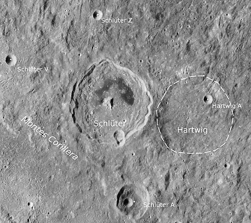 Hartwig es un cráter de impacto que se encuentra cerca de la extremidad occidental de la Luna. Está unido al borde oriental del prominente cráter Schlüter, al noreste de la cadena montañosa denominada Montes Cordillera, que rodea el Mare Orientale. Al este-noreste de Hartwig aparece el cráter más grande Riccioli.