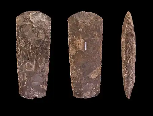 - ↑ Piezas de hechura bifacial podrían ser las puntas foliáceas bifaciales, las hojas de laurel…; pero, también, hachas talladas, herminettes, trinchetas, cinceles y puñales.