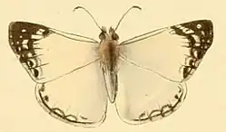 La envergadura es de 35 a 42 mm. La parte superior de los machos es blanca con marcas oscuras a lo largo de los márgenes exteriores de las alas. Las hembras tienen marcas más anchas que los machos y también tienen bases de alas grises. La parte inferior de las alas traseras tiene una mancha gris oliva en el tercio exterior que está muy separada del área media más pálida.