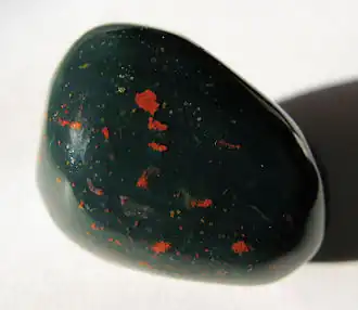 Las inclusiones rojas parecen manchas de sangre, por eso en inglés el mineral recibe el nombre bloodstone (literalmente 'piedra de sangre'), por sus manchas rojas . El nombre de heliotropo (del griego ήλιος helios, sol, τρέπειν trepein, girar) deriva de varias nociones antiguas acerca de la forma en la cual el mineral refleja la luz. Así fue descrito, por ejemplo, por Plinio (Nat. Hist. 37.165).