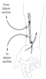 - Accesos permanentes. Los catéteres venosos con anclaje se están convirtiendo en una alternativa de acceso a la circulación de larga duración en pacientes en los que no puede crearse rápidamente un acceso AV. En este grupo de pacientes se incluyen niños pequeños, pacientes con diabetes y enfermedad renal grave, individuos con enfermedad renal mórbida y enfermos con múltiples accesos AV fallidos que no disponen de vasos adecuados para otro acceso AV. Otras indicaciones incluyen a pacientes con miocardiopatía incapaces de mantener la presión sanguínea o flujos adecuados del acceso y aquellos que requieren un acceso a la circulación más frecuente (hemodiálisis domiciliaria diaria nocturna).