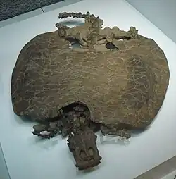 Medía alrededor de 1 m de anchura, y producto de la evolución convergente, tenía el aspecto de una tortuga con el caparazón aplastado. Este caparazón era un escudo óseo que servía de protección, y solo la cabeza, las patas y la cola sobresalían de éste.[1] De esta manera minimizaba el efecto de depredación mientras surcaba los mares buscando comida. Las mandíbulas del animal eran anchas y muy fuertes, gracias a la acción de poderosos músculos. Los huesos del paladar y las mandíbulas inferiores conferían una gran fuerza a la mordedura. Las patas eran cortas, y sus dedos estaban unidas por una delicada membrana epitelial, a semejanza de los patos. Probablemente, usaban las patas a modo de aletas para mejorar el rendimiento de la natación. La cola era corta y plana, y se movía a los lados mientras nadaba. La cabeza era pequeña, al igual que las cuencas oculares. Se cree que no tenía la facultad de retraer la cabeza bajo la concha como las tortugas actuales. A ambos lados de la parte superior del cráneo, poseía un orificio característico que también poseen otros reptiles.