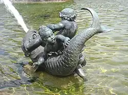 - Fuente de bronce en la mansión Miramar (1915). La fuente escultural está instalada en el jardín de la entrada frente a la fachada principal de estilo neoclásico francés en la Bellevue Avenue , Isla Aquidneck - en Newport (Rhode Island).[8] 41°27′30″N 71°18′17″O / 41.458285, -71.304767