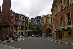 El diseño inicial estableció las columnas de apoyo detrás de la fachada pero las expresaba externamente ahuecando algunos de los pisos. Esto creaba bandas horizontales en la fachada que se alineaban con el ornamento de terracota en el Albert Hall.[27] La Planning Authority había pedido que la entrada del nuevo edificio estuviera enfrente del Albert Hall para reducir problemas de tráfico en Kensington Gore y esto era adecuado para Cadbury-Brown pues significaba que el Colegio podía apropiarse de este espacio como un patio de entrada.[28]