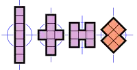 - 3 heptominós (de color violeta) tienen dos ejes de simetría de reflexión, ambos alineados con las líneas de la cuadrícula. El grupo de simetría tiene cuatro elementos, la identidad, dos reflexiones y la rotación de 180°. Es el grupo diédrico de orden 2.