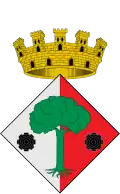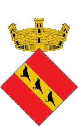 El escudo no ha sido normalizado ni oficializado por la Generalidad de Cataluña. El ayuntamiento del municipio utiliza el siguiente escudo: Cuartelado, con los cuatro palos del Casal de Barcelona (de gules) en campo de oro, en los cuarteles primero y cuarto, y cinco menguantes (ranvesadas) de plata en aspa, sobre campo de azur en los cuarteles segundo y tercero. Va timbrado con corona ducal.»[34] |