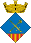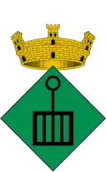 «De sinople, un pino de oro acostado de dos llaves pasadas en aspa con los dientes arriba y mirando hacia fuera, la de oro en banda y por encima de la de plata en barra, a diestra, y de una aspa de oro a siniestra. Al timbre, una corona mural de pueblo.»[35] El escudo en uso por el Ayuntamiento está aprobado por la Generalidad de Cataluña, a fecha de 10/06/1997. |
