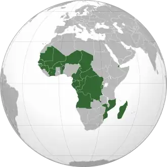 En los países que fueron antiguamente colonias francesas y belgas, el francés es hablado en los siguientes países y territorios como la República Democrática del Congo (ex Zaire), República del Congo, Burkina Faso, Senegal, Guinea, Malí, Chad, Níger, Burundi, Ruanda, Togo, Benín, República Centroafricana, Gabón, Costa de Marfil, Madagascar, Mauricio, Yibuti, islas Seychelles, Camerún (que fue partido en dos zonas: una zona francesa (la más importante) y una zona inglesa), islas Comoras, las islas de la Reunión y Mayotte, que son territorio francés, y una parte de la población de la Guinea Ecuatorial, que lo emplea junto con el español como lengua oficial, Marruecos, Argelia, Mauritania y Túnez, donde se habla junto con el árabe y los dialectos bereberes, en Egipto, donde es muy minoritario, pero que se utiliza como lengua de cultura; así, la Universidad Senghor de Alejandría (Université Senghor d'Alexandrie) es francófona.