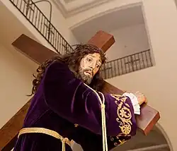 Aunque la talla viste una túnica de terciopelo de seda morado y rico bordado en hilo de oro, restaurada en 2007, es una imagen totalmente tallada y de tamaño natural. Es llevado a hombros de 20 cofrades, y se puede visitar en la Iglesia del Convento.