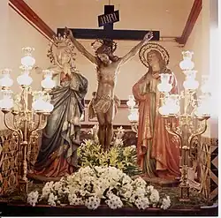 Las imágenes del Stmo. Cristo, la Virgen de los Dolores y San Juan Evangelista pasaron a formar parte del patrimonio de la hermandad hacia el año 1943, cuando la familia Montoliu-Palmer donó las imágenes de San Juan y la Virgen dolorosa, que había adquirido en el desaparecido taller de los Sucesores de José J. Sacrest y Cía de Olot. De este mismo taller procede la imagen de Cristo Crucificado, también donación de una familia nulense, la familia Ramón-Arambul. Inicialmente, cada una de las imágenes procesionaba en peanas independientes. Ya en los años 60 consta que las tres imágenes estaban agrupadas en una misma carroza, dotando al paso del aspecto actual.