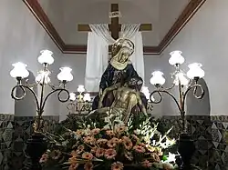 El rostro de la Virgen conjuga el dolor por la muerte del Cristo y compasión por los pecados de la humanidad. Con su mano izquierda la Virgen acaricia el rostro de Cristo en un claro signo de ternura.